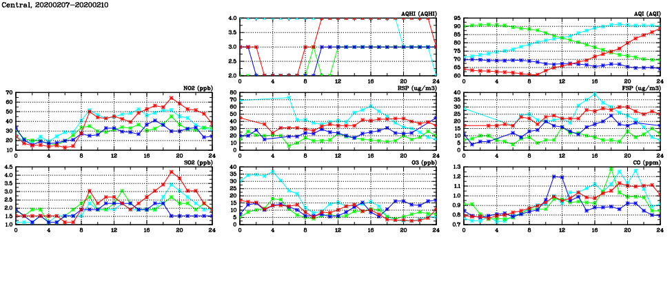 | Air Quality Data Time Series in Central (2020/02/10) | ( Line colors: Day -3 Day -2 Day -1 Current day ) | 2D Map Current AQHI |