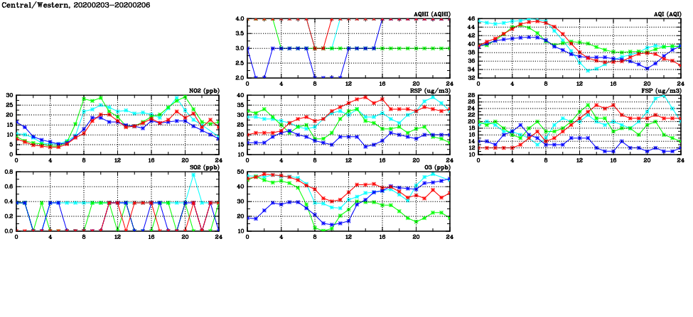 | Air Quality Data Time Series in Central/Western (2020/02/06) | ( Line colors: Day -3 Day -2 Day -1 Current day ) | 2D Map Current AQHI |