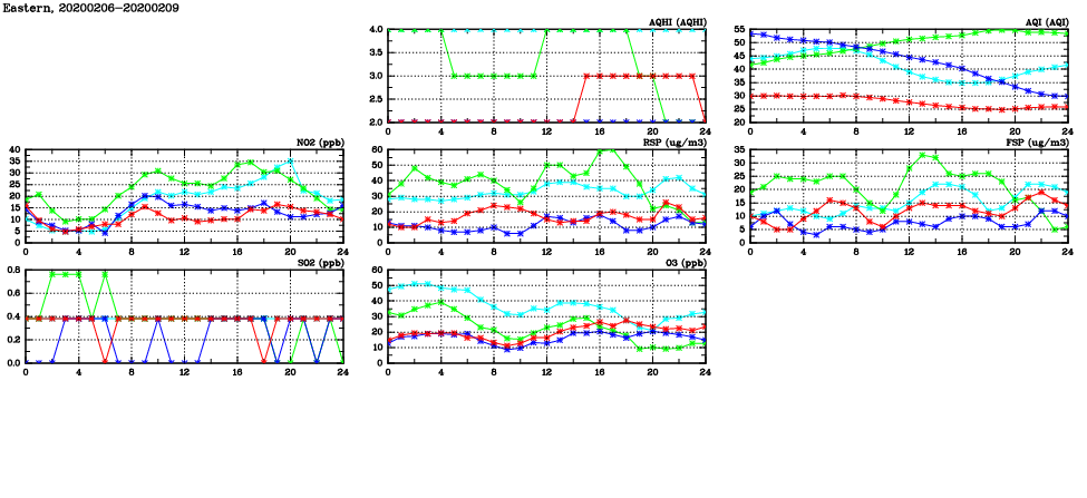 | Air Quality Data Time Series in Eastern (2020/02/09) | ( Line colors: Day -3 Day -2 Day -1 Current day ) | 2D Map Current AQHI |