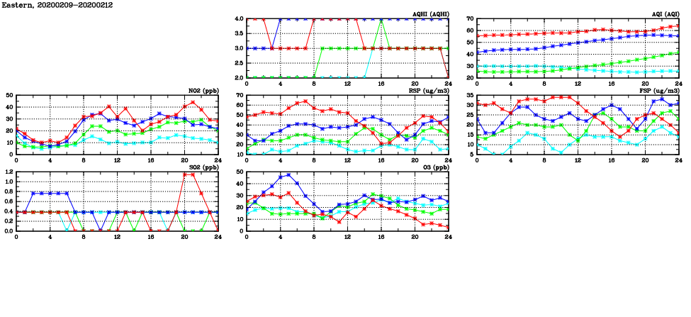 | Air Quality Data Time Series in Eastern (2020/02/12) | ( Line colors: Day -3 Day -2 Day -1 Current day ) | 2D Map Current AQHI |