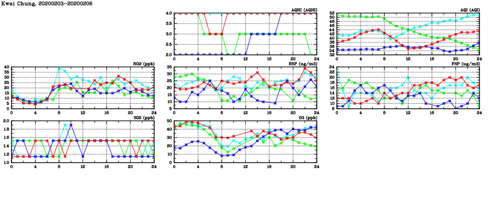 | Air Quality Data Time Series in Kwai Chung (2020/02/06) | ( Line colors: Day -3 Day -2 Day -1 Current day ) | 2D Map Current AQHI |