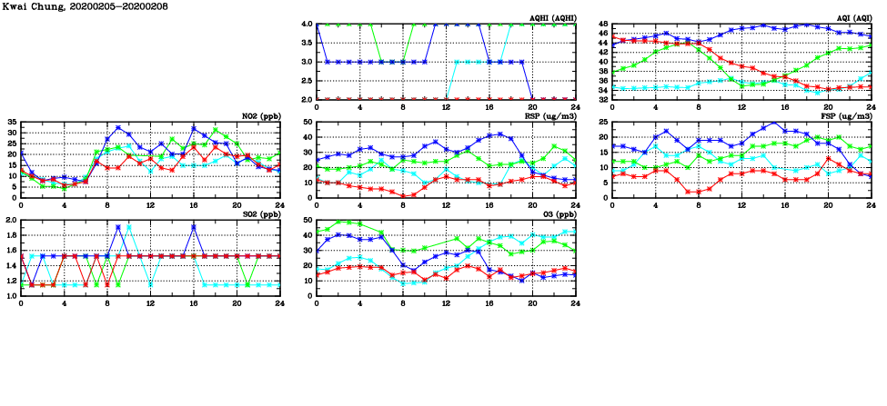| Air Quality Data Time Series in Kwai Chung (2020/02/08) | ( Line colors: Day -3 Day -2 Day -1 Current day ) | 2D Map Current AQHI |