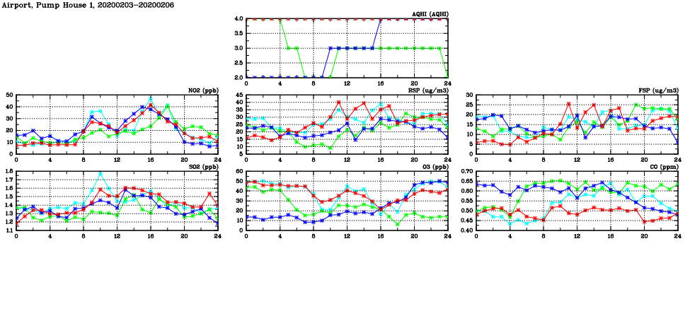 | Air Quality Data Time Series in Airport, Pump House 1 (2020/02/06) | ( Line colors: Day -3 Day -2 Day -1 Current day ) | 2D Map Current AQHI |