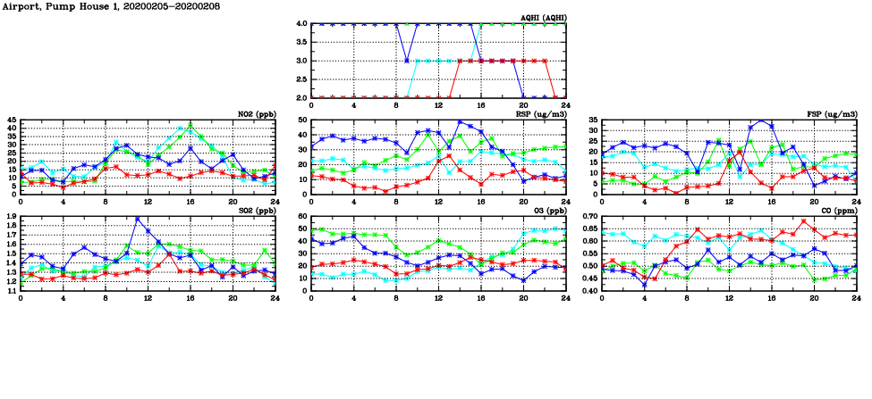 | Air Quality Data Time Series in Airport, Pump House 1 (2020/02/08) | ( Line colors: Day -3 Day -2 Day -1 Current day ) | 2D Map Current AQHI |
