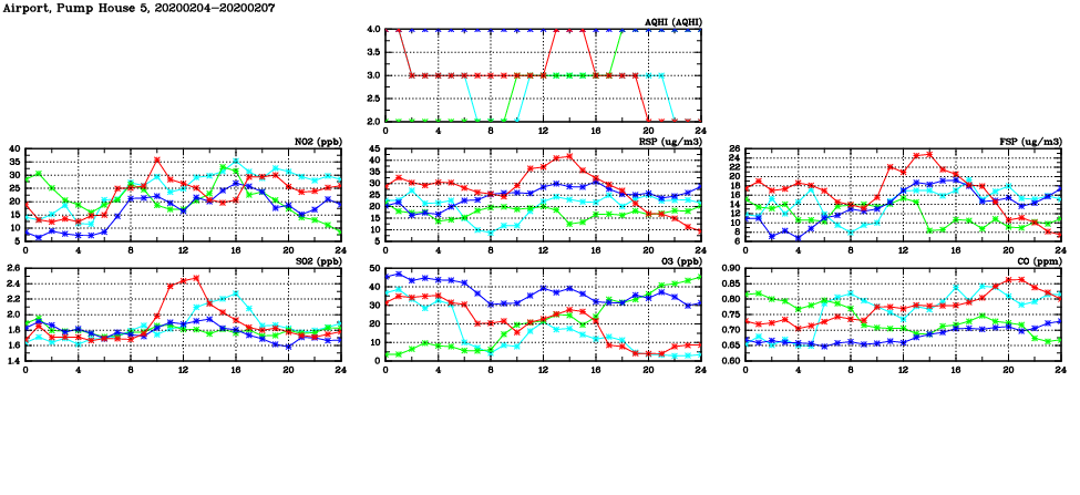 | Air Quality Data Time Series in Airport, Pump House 5 (2020/02/07) | ( Line colors: Day -3 Day -2 Day -1 Current day ) | 2D Map Current AQHI |