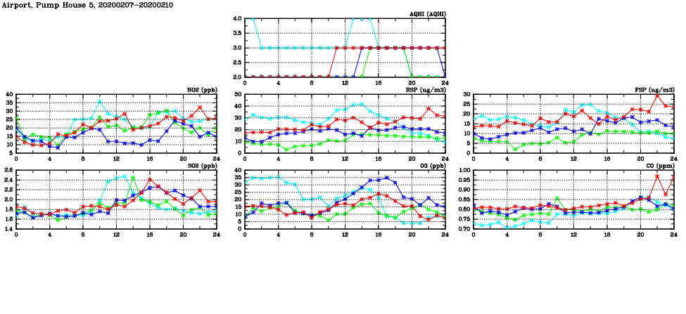| Air Quality Data Time Series in Airport, Pump House 5 (2020/02/10) | ( Line colors: Day -3 Day -2 Day -1 Current day ) | 2D Map Current AQHI |
