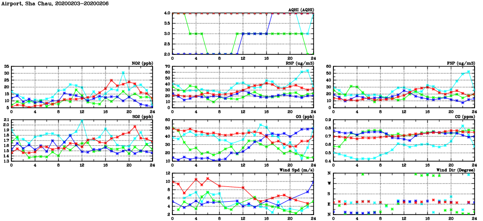 | Air Quality Data Time Series in Airport, Sha Chau (2020/02/06) | ( Line colors: Day -3 Day -2 Day -1 Current day ) | 2D Map Current AQHI |