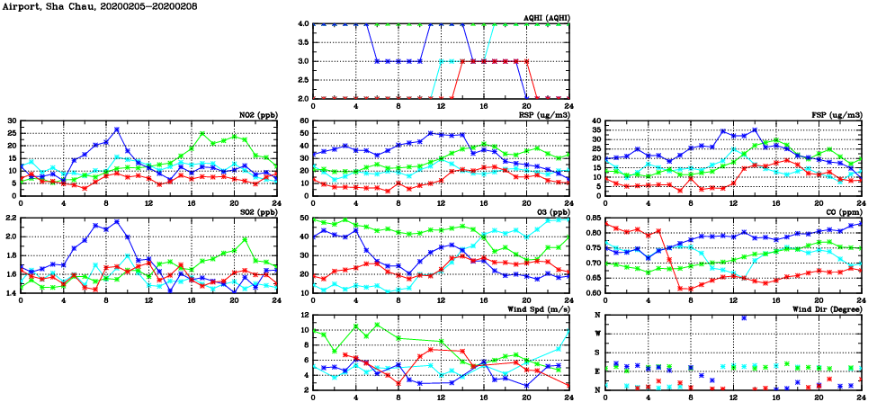 | Air Quality Data Time Series in Airport, Sha Chau (2020/02/08) | ( Line colors: Day -3 Day -2 Day -1 Current day ) | 2D Map Current AQHI |