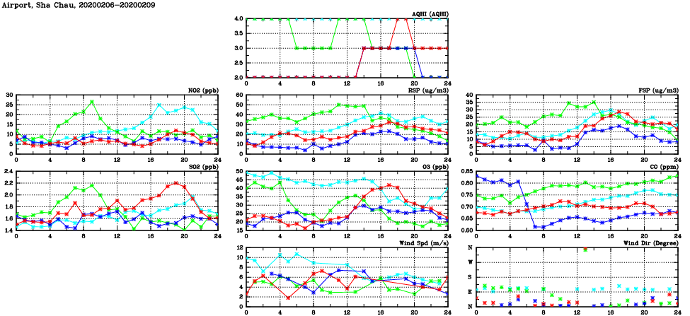 | Air Quality Data Time Series in Airport, Sha Chau (2020/02/09) | ( Line colors: Day -3 Day -2 Day -1 Current day ) | 2D Map Current AQHI |