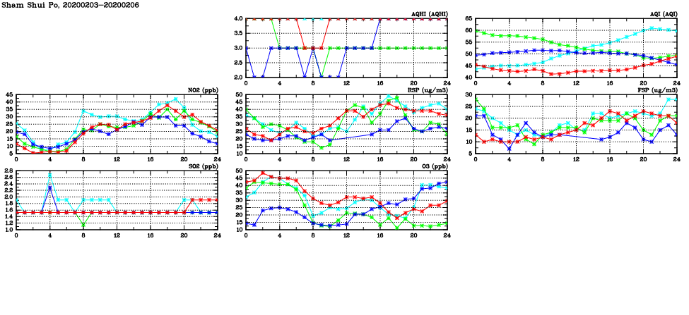 | Air Quality Data Time Series in Sham Shui Po (2020/02/06) | ( Line colors: Day -3 Day -2 Day -1 Current day ) | 2D Map Current AQHI |