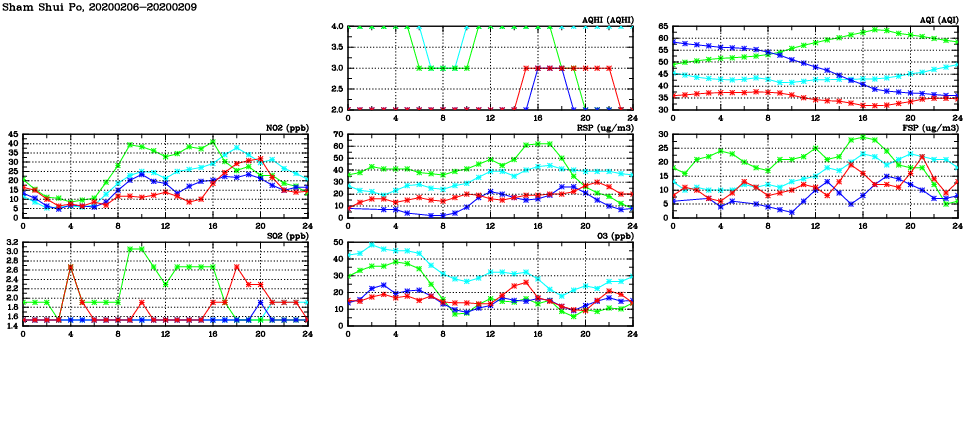 | Air Quality Data Time Series in Sham Shui Po (2020/02/09) | ( Line colors: Day -3 Day -2 Day -1 Current day ) | 2D Map Current AQHI |