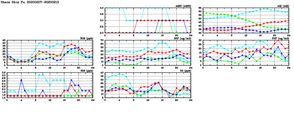 | Air Quality Data Time Series in Sham Shui Po (2020/02/10) | ( Line colors: Day -3 Day -2 Day -1 Current day ) | 2D Map Current AQHI |