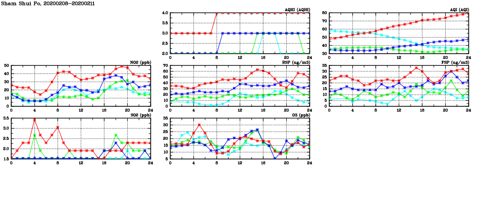 | Air Quality Data Time Series in Sham Shui Po (2020/02/11) | ( Line colors: Day -3 Day -2 Day -1 Current day ) | 2D Map Current AQHI |