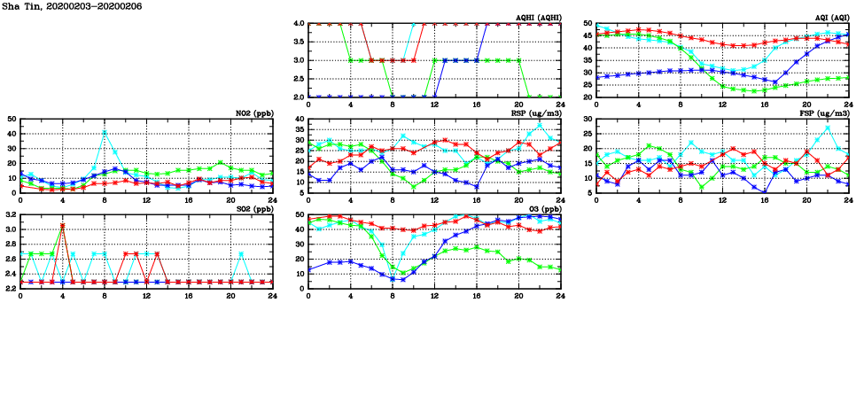 | Air Quality Data Time Series in Sha Tin (2020/02/06) | ( Line colors: Day -3 Day -2 Day -1 Current day ) | 2D Map Current AQHI |