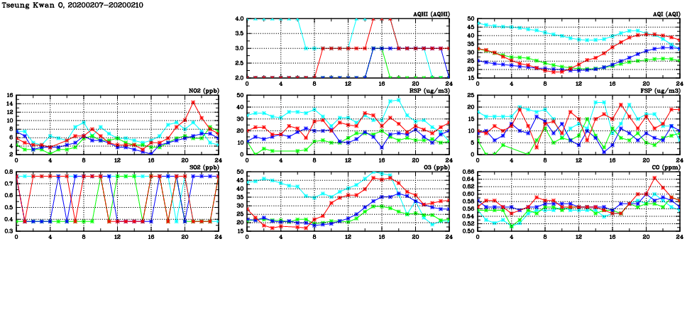 | Air Quality Data Time Series in Tseung Kwan O (2020/02/10) | ( Line colors: Day -3 Day -2 Day -1 Current day ) | 2D Map Current AQHI |