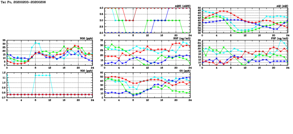 | Air Quality Data Time Series in Tai Po (2020/02/06) | ( Line colors: Day -3 Day -2 Day -1 Current day ) | 2D Map Current AQHI |