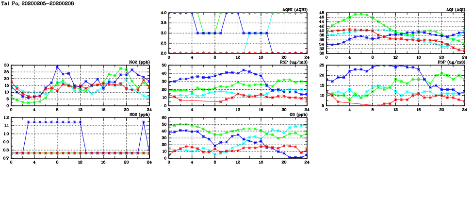 | Air Quality Data Time Series in Tai Po (2020/02/08) | ( Line colors: Day -3 Day -2 Day -1 Current day ) | 2D Map Current AQHI |