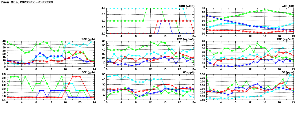 | Air Quality Data Time Series in Tuen Mun (2020/02/09) | ( Line colors: Day -3 Day -2 Day -1 Current day ) | 2D Map Current AQHI |