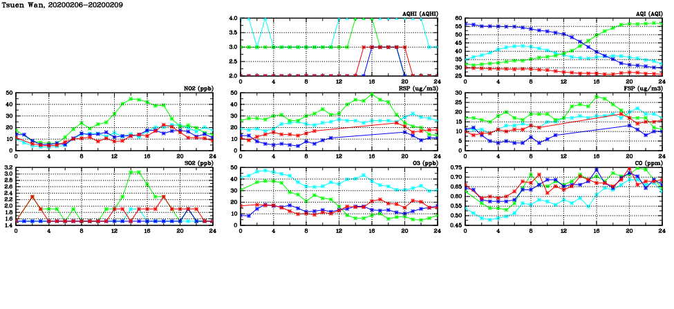Air Quality Data Time Series in Tsuen Wan (2020/02/09) | ( Line colors: Day -3 Day -2 Day -1 Current day ) | 2D Map Current AQHI |