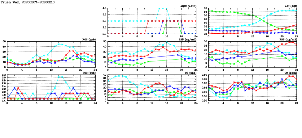 | Air Quality Data Time Series in Tsuen Wan (2020/02/10) | ( Line colors: Day -3 Day -2 Day -1 Current day ) | 2D Map Current AQHI |
