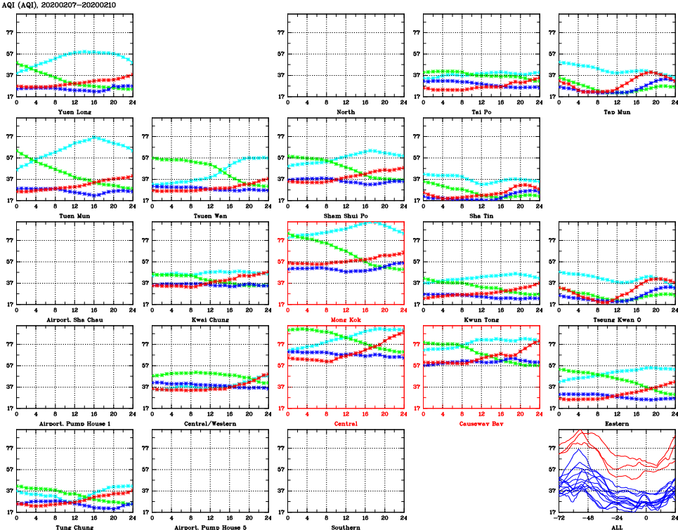| Air Quality Data Time Series for AQI (2020/02/10) | ( Line colors: Day -3 Day -2 Day -1 Current day ) | 2D Map Current AQHI |