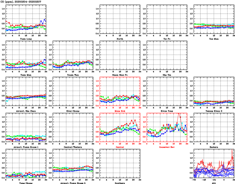 | Air Quality Data Time Series for CO (2020/02/07) | ( Line colors: Day -3 Day -2 Day -1 Current day ) | 2D Map Current AQHI |