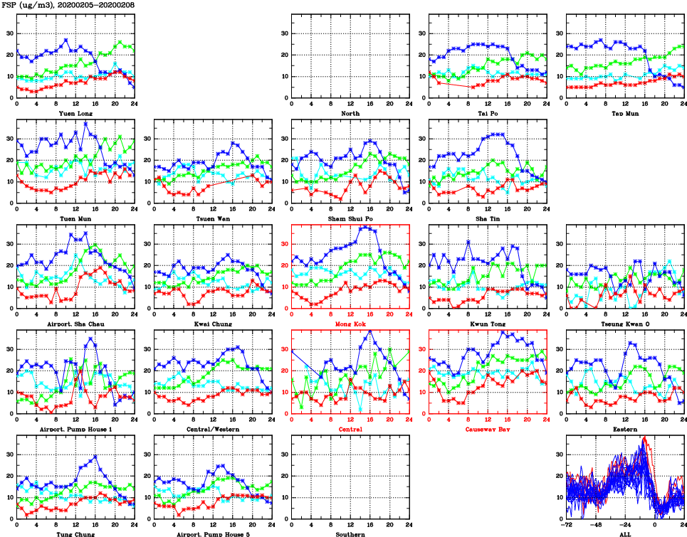 | Air Quality Data Time Series for FSP (2020/02/08) | ( Line colors: Day -3 Day -2 Day -1 Current day ) | 2D Map Current AQHI |