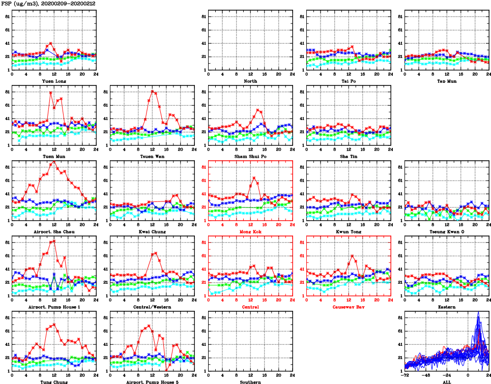 | Air Quality Data Time Series for FSP (2020/02/12) | ( Line colors: Day -3 Day -2 Day -1 Current day ) | 2D Map Current AQHI |
