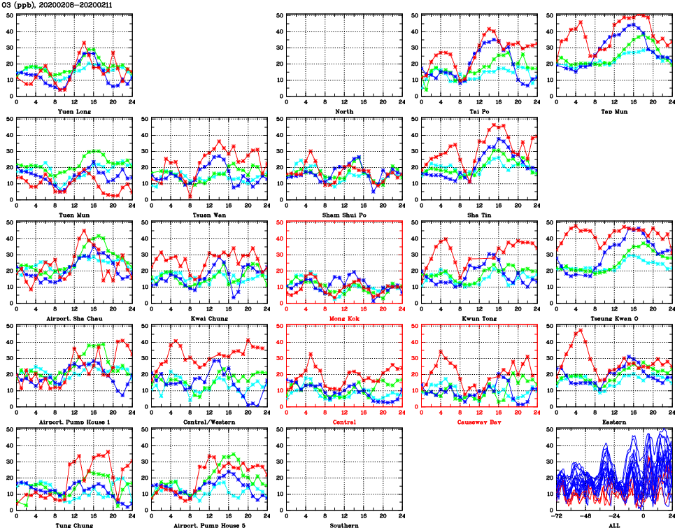 | Air Quality Data Time Series for O3 (2020/02/11) | ( Line colors: Day -3 Day -2 Day -1 Current day ) | 2D Map Current AQHI |