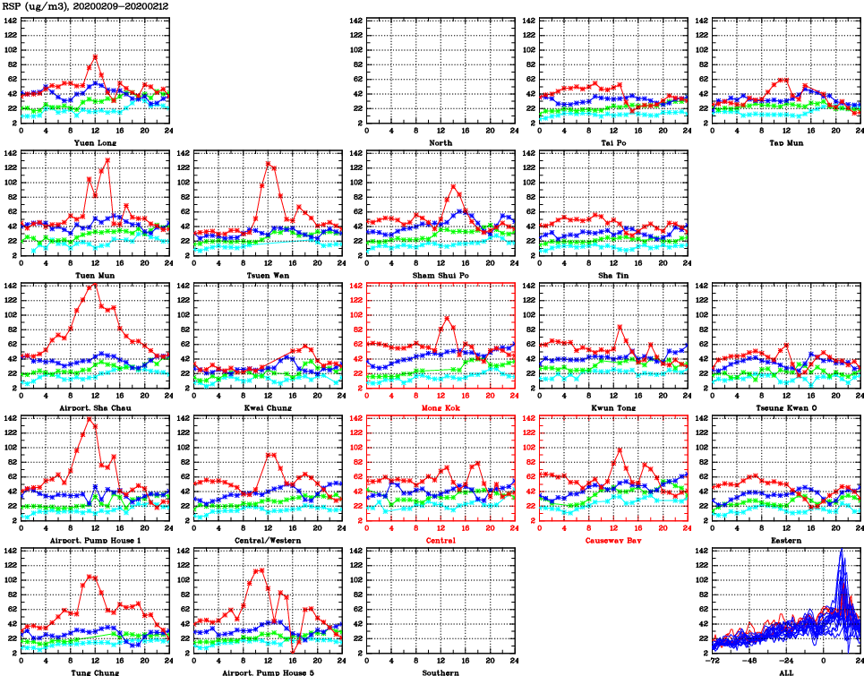 | Air Quality Data Time Series for RSP (2020/02/12) | ( Line colors: Day -3 Day -2 Day -1 Current day ) | 2D Map Current AQHI |