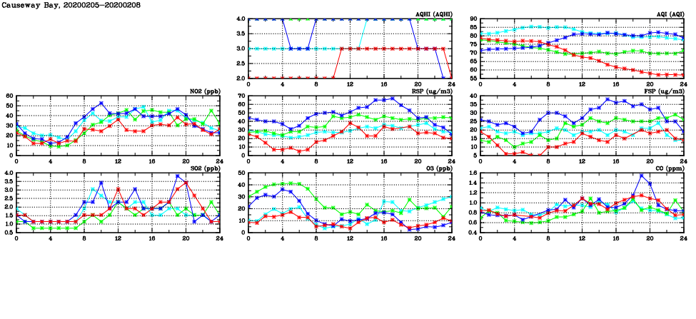 | Air Quality Data Time Series in Causeway Bay (2020/02/08) | ( Line colors: Day -3 Day -2 Day -1 Current day ) | 2D Map Current AQHI |
