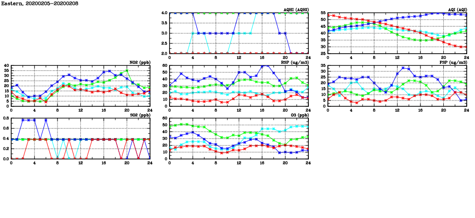 | Air Quality Data Time Series in Eastern (2020/02/08) | ( Line colors: Day -3 Day -2 Day -1 Current day ) | 2D Map Current AQHI |