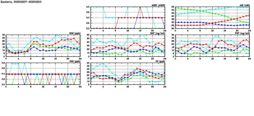 | Air Quality Data Time Series in Eastern (2020/02/10) | ( Line colors: Day -3 Day -2 Day -1 Current day ) | 2D Map Current AQHI |