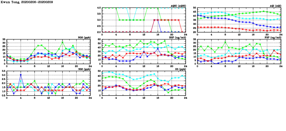 | Air Quality Data Time Series in Kwun Tong (2020/02/09) | ( Line colors: Day -3 Day -2 Day -1 Current day ) | 2D Map Current AQHI |