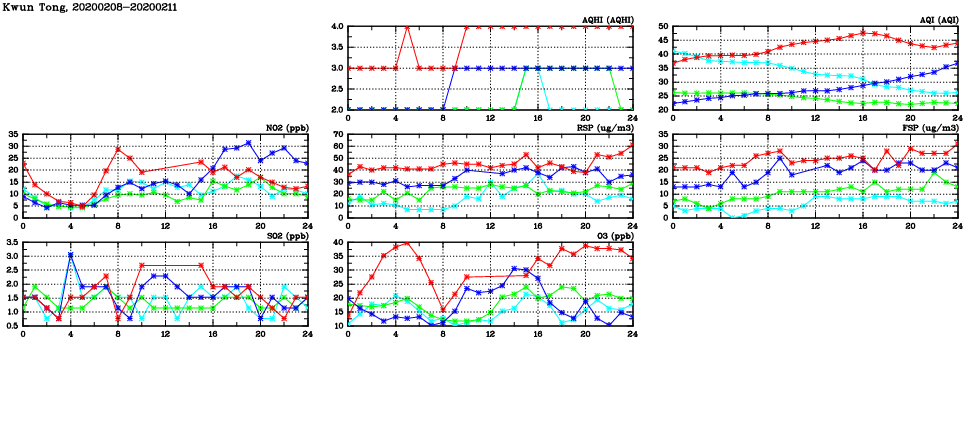 | Air Quality Data Time Series in Kwun Tong (2020/02/11) | ( Line colors: Day -3 Day -2 Day -1 Current day ) | 2D Map Current AQHI |