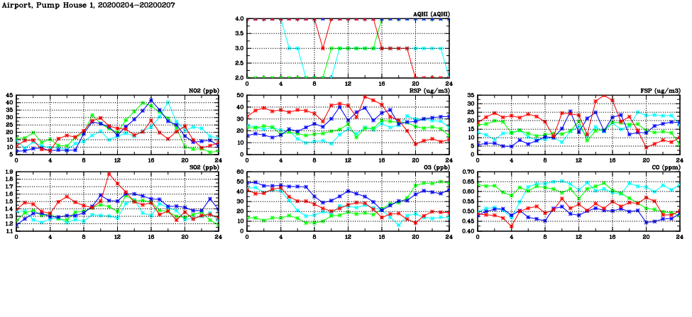 | Air Quality Data Time Series in Airport, Pump House 1 (2020/02/07) | ( Line colors: Day -3 Day -2 Day -1 Current day ) | 2D Map Current AQHI |