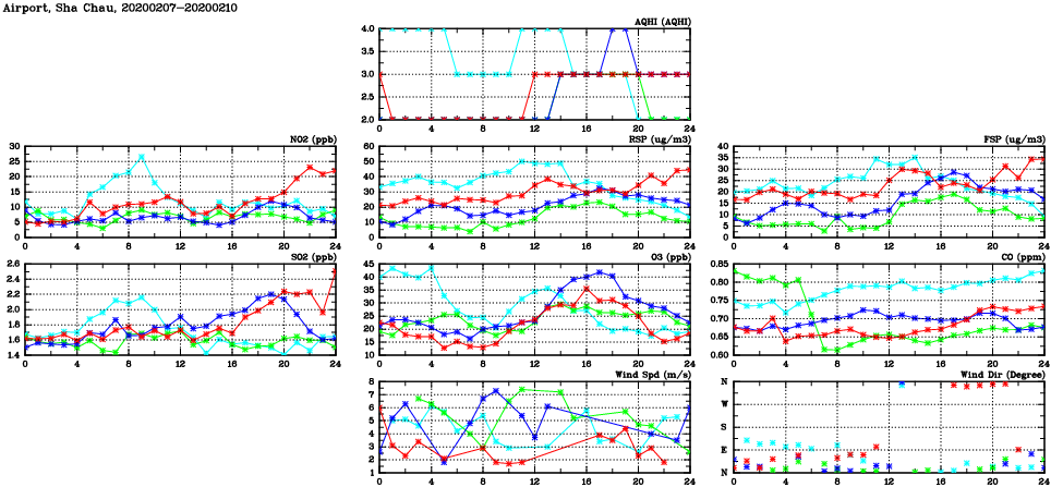 | Air Quality Data Time Series in Airport, Sha Chau (2020/02/10) | ( Line colors: Day -3 Day -2 Day -1 Current day ) | 2D Map Current AQHI |