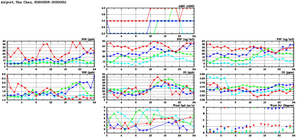 | Air Quality Data Time Series in Airport, Sha Chau (2020/02/11) | ( Line colors: Day -3 Day -2 Day -1 Current day ) | 2D Map Current AQHI |