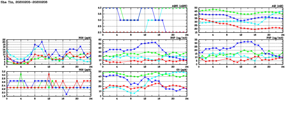 | Air Quality Data Time Series in Sha Tin (2020/02/08) | ( Line colors: Day -3 Day -2 Day -1 Current day ) | 2D Map Current AQHI |