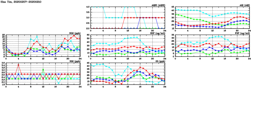 | Air Quality Data Time Series in Sha Tin (2020/02/10) | ( Line colors: Day -3 Day -2 Day -1 Current day ) | 2D Map Current AQHI |