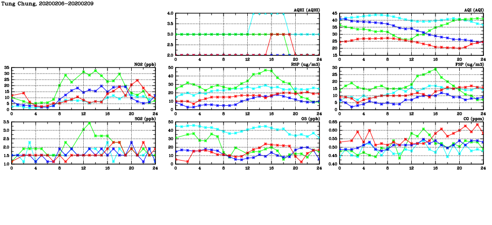 | Air Quality Data Time Series in Tung Chung (2020/02/09) | ( Line colors: Day -3 Day -2 Day -1 Current day ) | 2D Map Current AQHI |