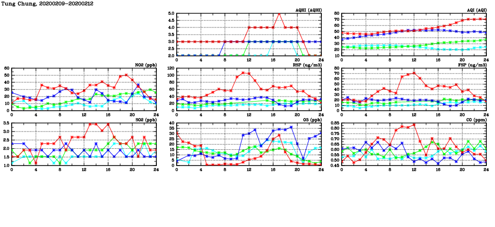| Air Quality Data Time Series in Tung Chung (2020/02/12) | ( Line colors: Day -3 Day -2 Day -1 Current day ) | 2D Map Current AQHI |