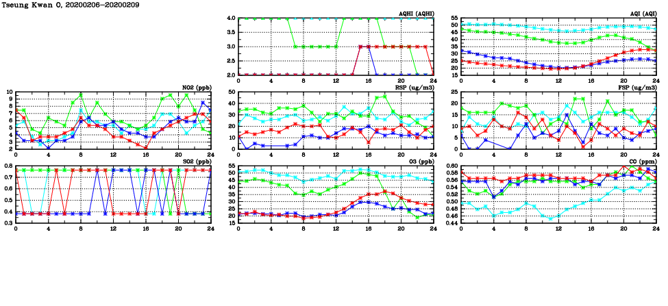 | Air Quality Data Time Series in Tseung Kwan O (2020/02/09) | ( Line colors: Day -3 Day -2 Day -1 Current day ) | 2D Map Current AQHI |