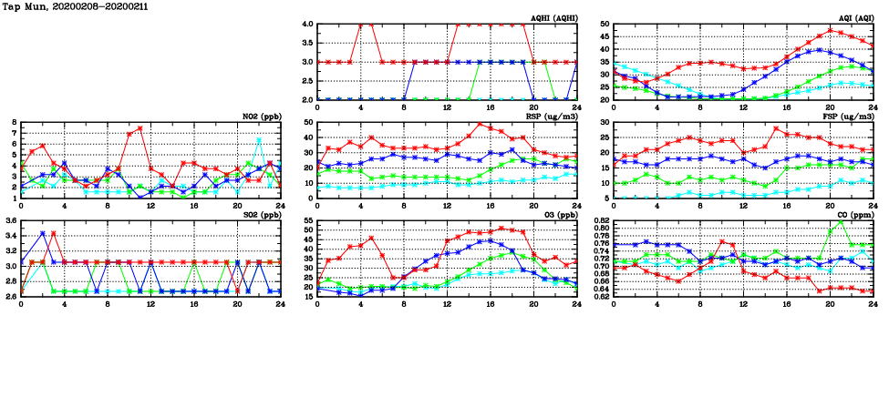 | Air Quality Data Time Series in Tap Mun (2020/02/11) | ( Line colors: Day -3 Day -2 Day -1 Current day ) | 2D Map Current AQHI |