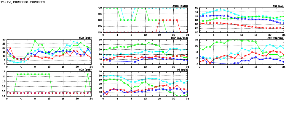 | Air Quality Data Time Series in Tai Po (2020/02/09) | ( Line colors: Day -3 Day -2 Day -1 Current day ) | 2D Map Current AQHI |