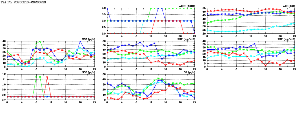 | Air Quality Data Time Series in Tai Po (2020/02/13) | ( Line colors: Day -3 Day -2 Day -1 Current day ) | 2D Map Current AQHI |