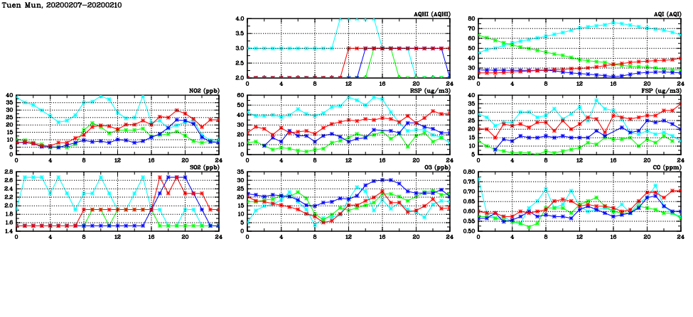 | Air Quality Data Time Series in Tuen Mun (2020/02/10) | ( Line colors: Day -3 Day -2 Day -1 Current day ) | 2D Map Current AQHI |