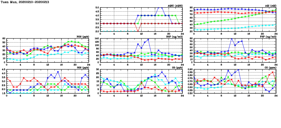 | Air Quality Data Time Series in Tuen Mun (2020/02/13) | ( Line colors: Day -3 Day -2 Day -1 Current day ) | 2D Map Current AQHI |
