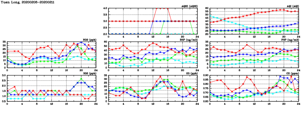 | Air Quality Data Time Series in Yuen Long (2020/02/11) | ( Line colors: Day -3 Day -2 Day -1 Current day ) | 2D Map Current AQHI |