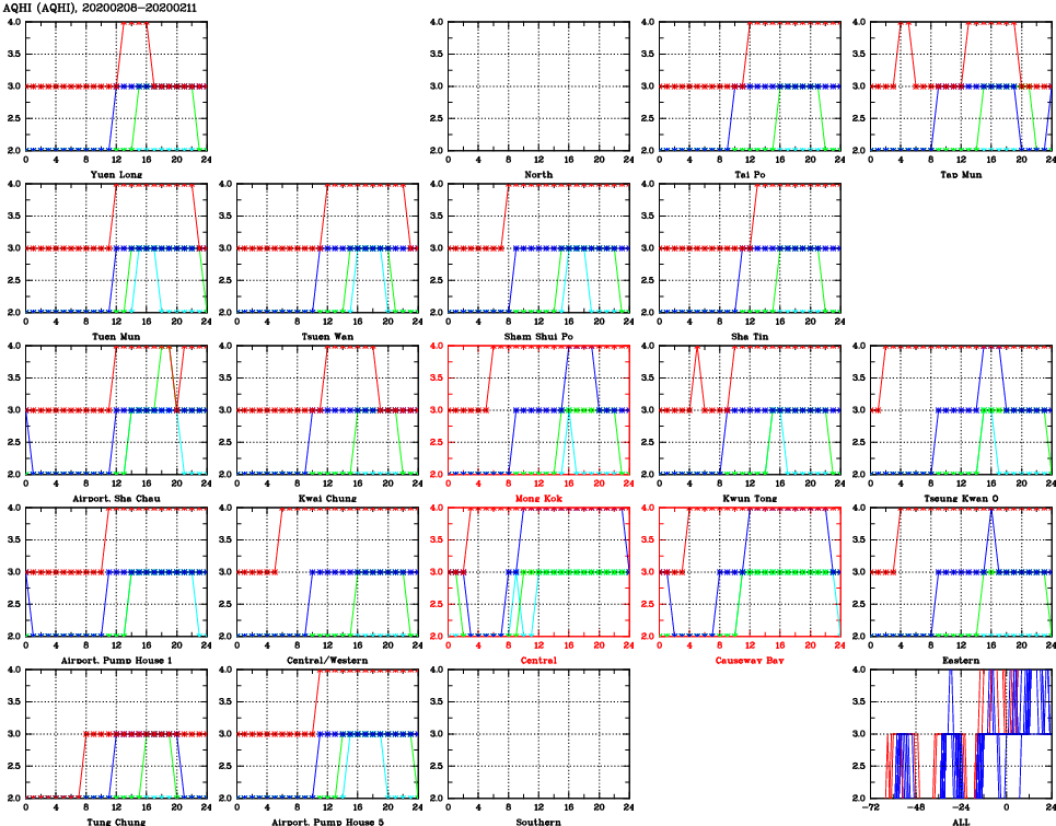 | Air Quality Data Time Series for AQHI (2020/02/11) | ( Line colors: Day -3 Day -2 Day -1 Current day ) | 2D Map Current AQHI |